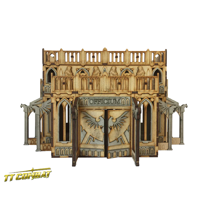 The Gothic Officium is made from 3mm MDF and 1mm Greyboard. It is easy to put together and looks great on the tabletop. Great scenery to use with 40K and other 28-35mm wargames. Model supplied unpainted and will require assembly. Includes accessories for cover. We advise using PVA glue for the best results.