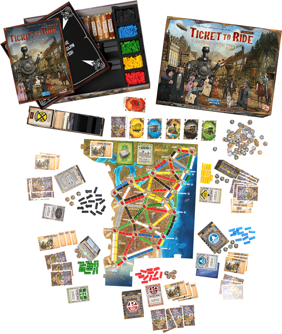 Ticket to Ride® Legacy: Legends of the West finally gives you the chance to step into the story of your favourite train game and explore the imagination of Rob Daviau, Matt Leacock and Alan R. Moon. You will embark on a journey across twelve games, managing your own North American railway company to wealth and fortune in a campaign full of adventures.