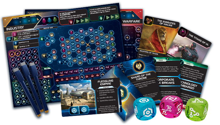 Twilight Inscription, an epic roll-and-write game for one to eight players, offers an experience unlike anything Fantasy Flight Games has done before. With a limited pool of resources at your disposal, you’ll need to carefully manage Navigation, Expansion, Industry, and Warfare as you amass victory points and earn your right to the throne on Mecatol Rex. Will your faction become the new rulers of the galaxy? Or will your fledgling empire fade into obscurity? Anything can happen in this strategic, infinitely-replayable game!